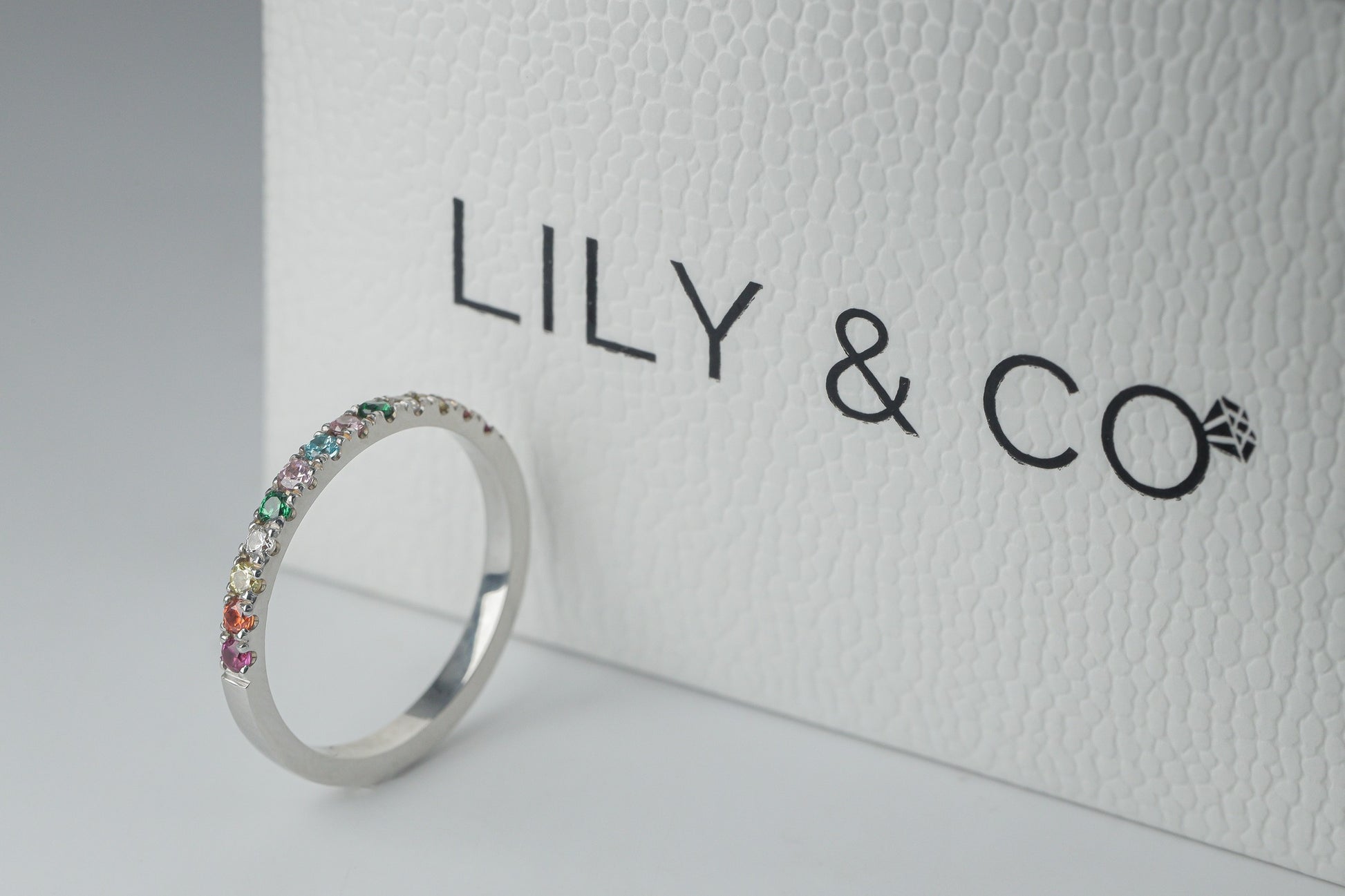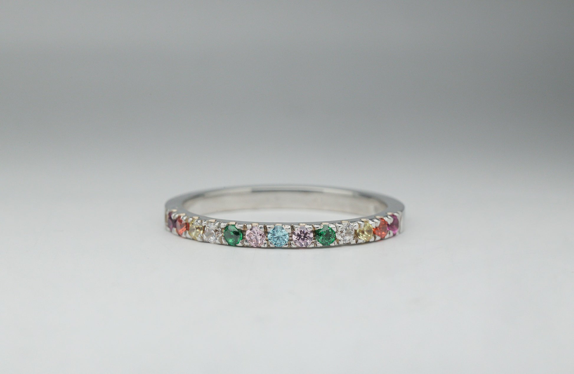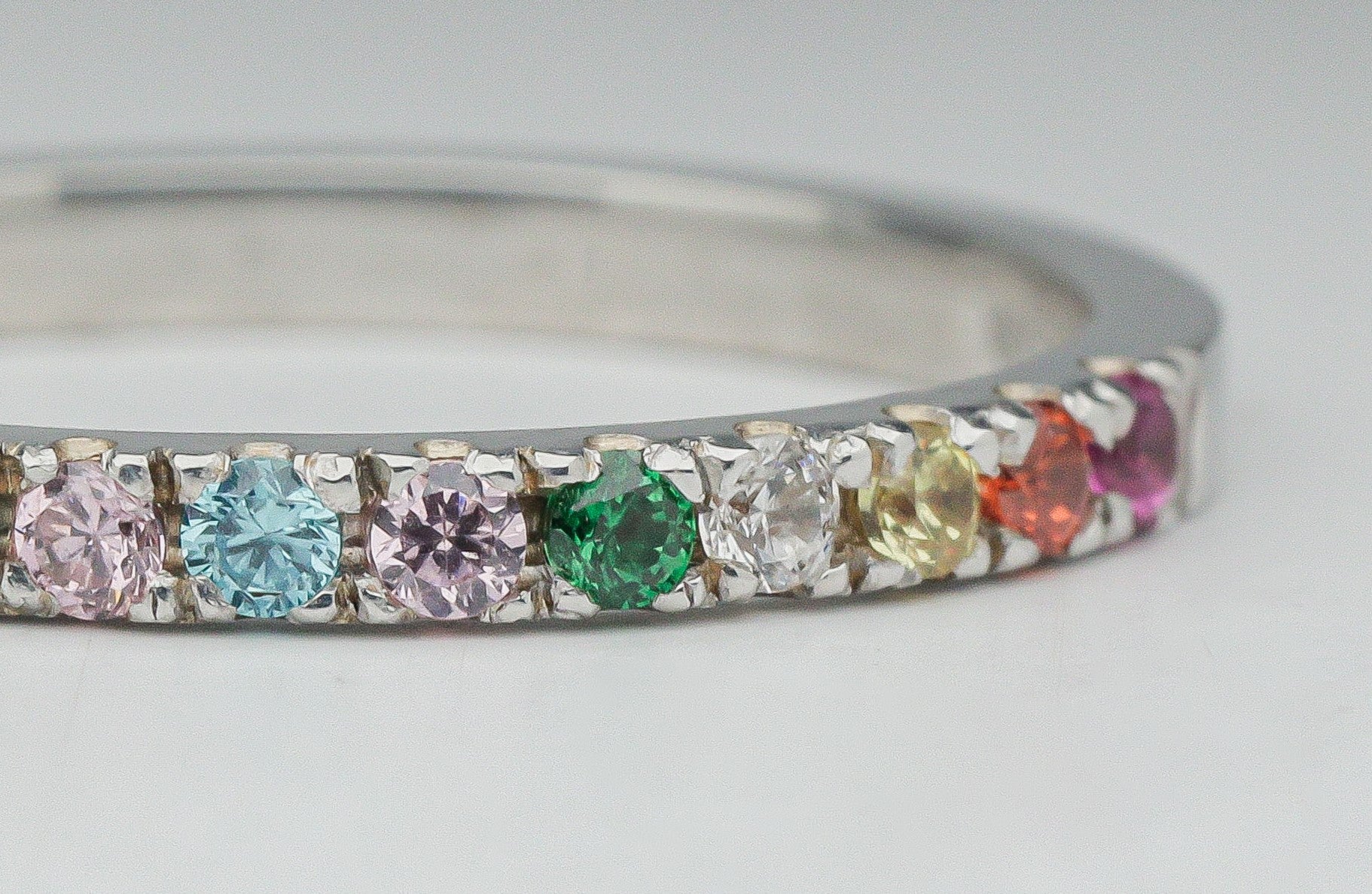 Stones: .02ct - center, aquamarine .02ct – 1pc each side(2pcs in total), pink sapphire .02ct - 1pc each side(2pcs in total), peridot .02ct - 1pc each side(2pcs in total), white sapphire .02ct - 1pc each side(2pcs in total), citrine .02ct - 1pc each side(2pcs in total), orange garnet .02ct - 1pc each side(2pcs in total), ruby